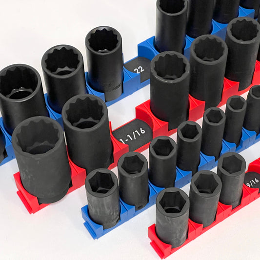 Our fully modular socket organizers are designed to fit any socket set no matter the size range. Each piece can be added or removed from the organizer match your socket set allowing you to optimize the space in your toolbox. Every organizer set comes in a variety of color schemes. You can individually select the color of the organizer and the label to get the look you want. We currently have organizers for chrome and impact sockets and some bit sockets. This product line will continue to grow.