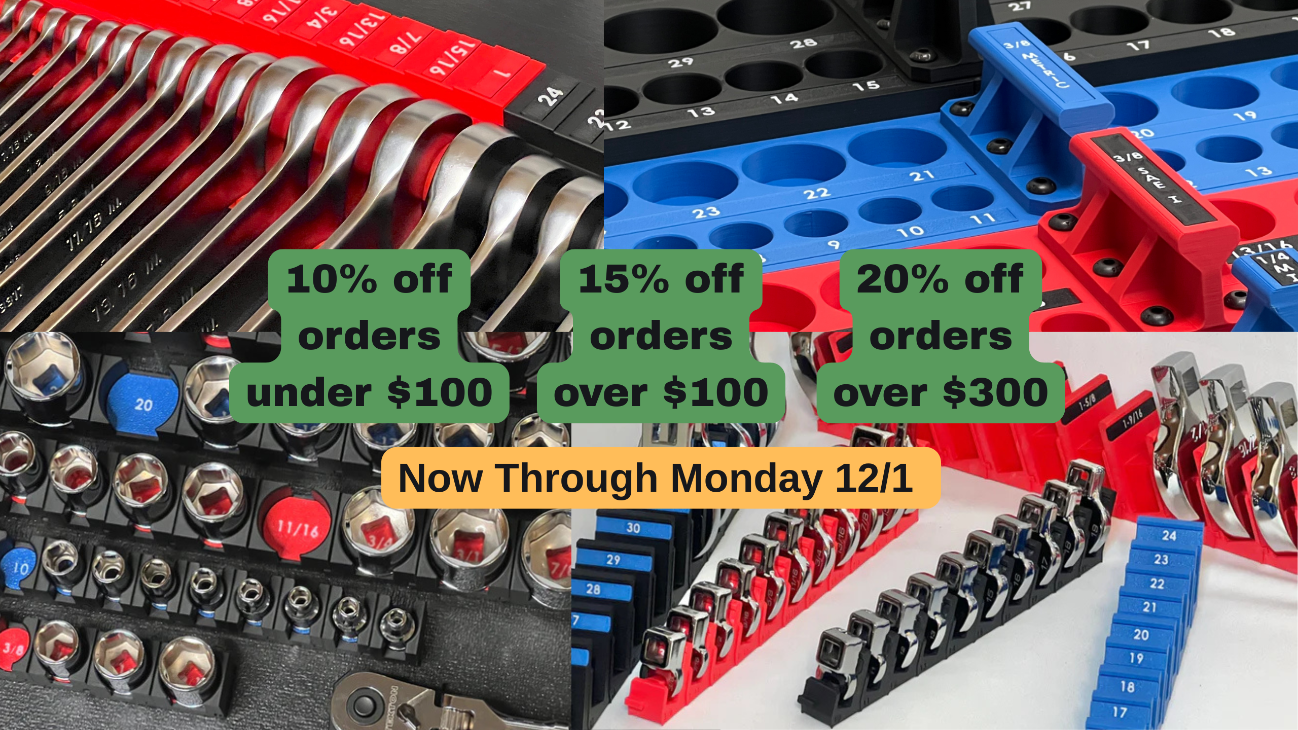 Our fully modular socket organizers are designed to fit any socket set no matter the size range. Each piece can be added or removed from the organizer match your socket set allowing you to optimize the space in your toolbox. Every organizer set comes in a variety of color schemes. You can individually select the color of the organizer and the label to get the look you want. We currently have organizers for chrome and impact sockets and some bit sockets. This product line will continue to grow.