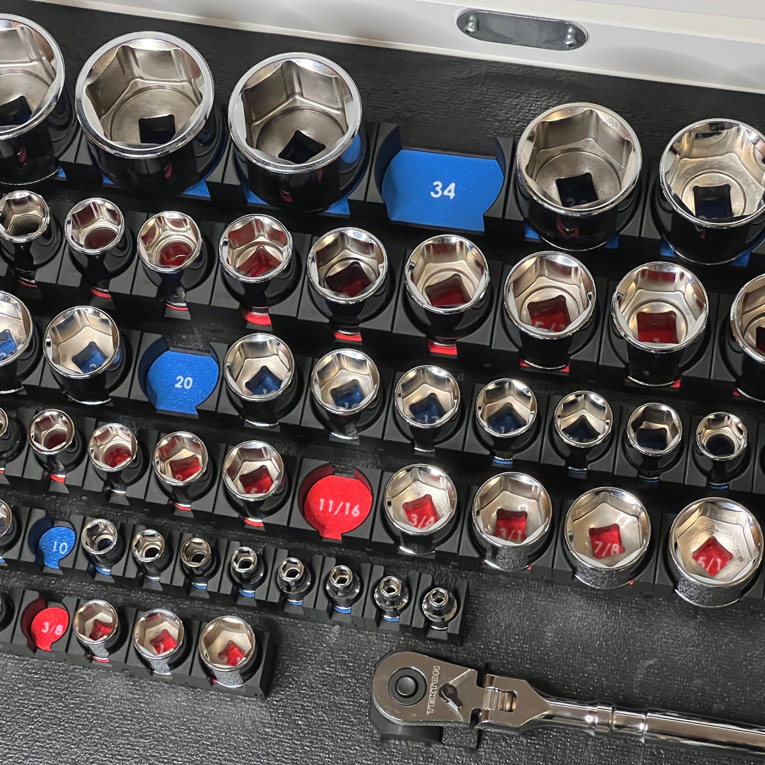 Our fully modular socket organizers are designed to fit any socket set no matter the size range. Each piece can be added or removed from the organizer match your socket set allowing you to optimize the space in your toolbox. Every organizer set comes in a variety of color schemes. You can individually select the color of the organizer and the label to get the look you want. We currently have organizers for chrome and impact sockets and some bit sockets. This product line will continue to grow.