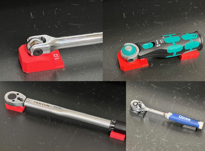 Each ratchet organizer comes with magnets in the base that firmly hold the organizer to a metal toolbox drawer. Each organizer comes with 2 pieces, one piece for the head of the ratchet and one piece for the handle. Our ratchet organizers will fit almost any ratchet, torque wrench, or breaker bar of of the corresponding drive size.