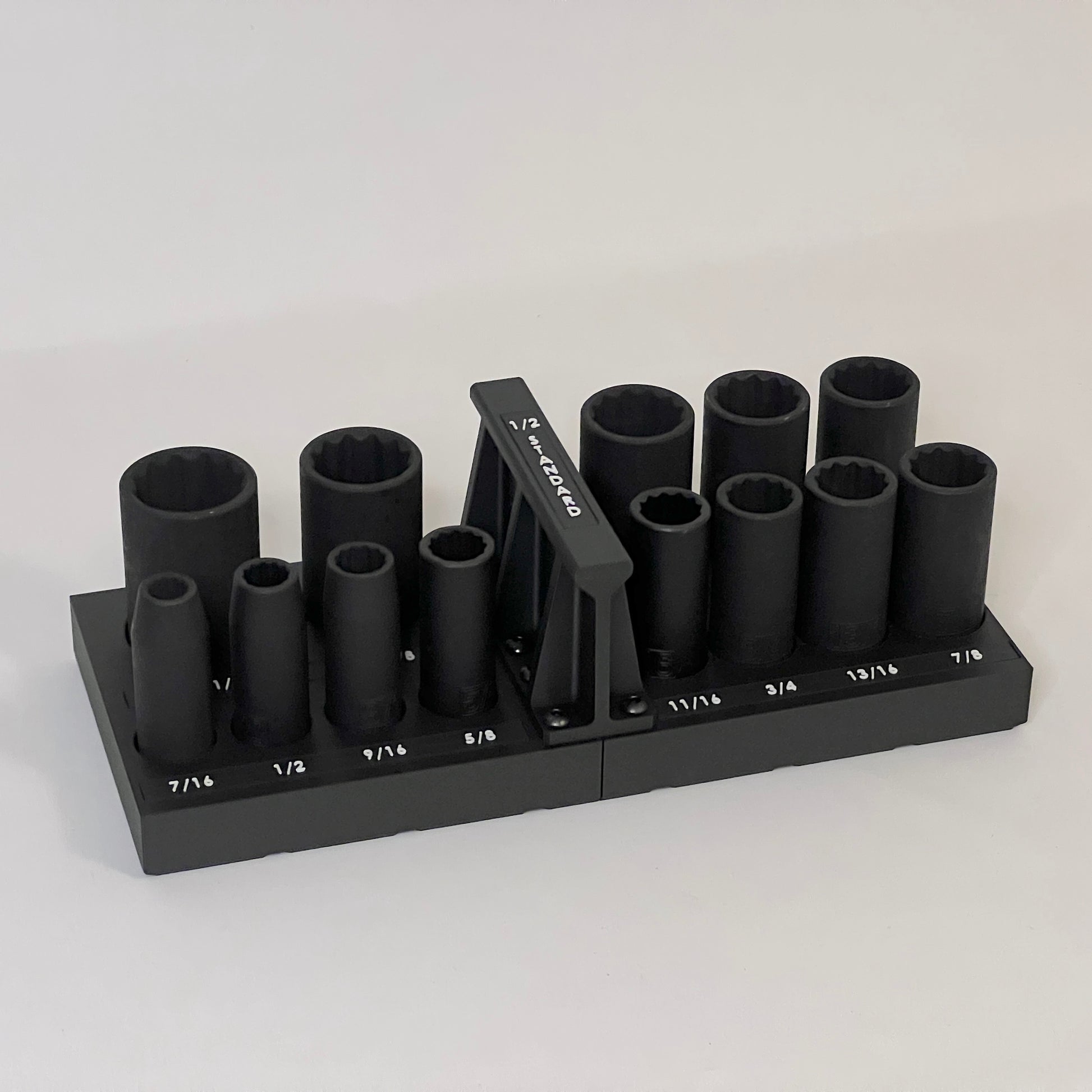 These socket organizers have a size range to match Harbor Freight's popular Pittsburgh deep 1/2" drive SAE socket sets, but were designed to fit any 1/2" drive impact sockets. Each organizer comes with a center mounted handle allowing for easy removal and transportation of the set from toolbox to work area.