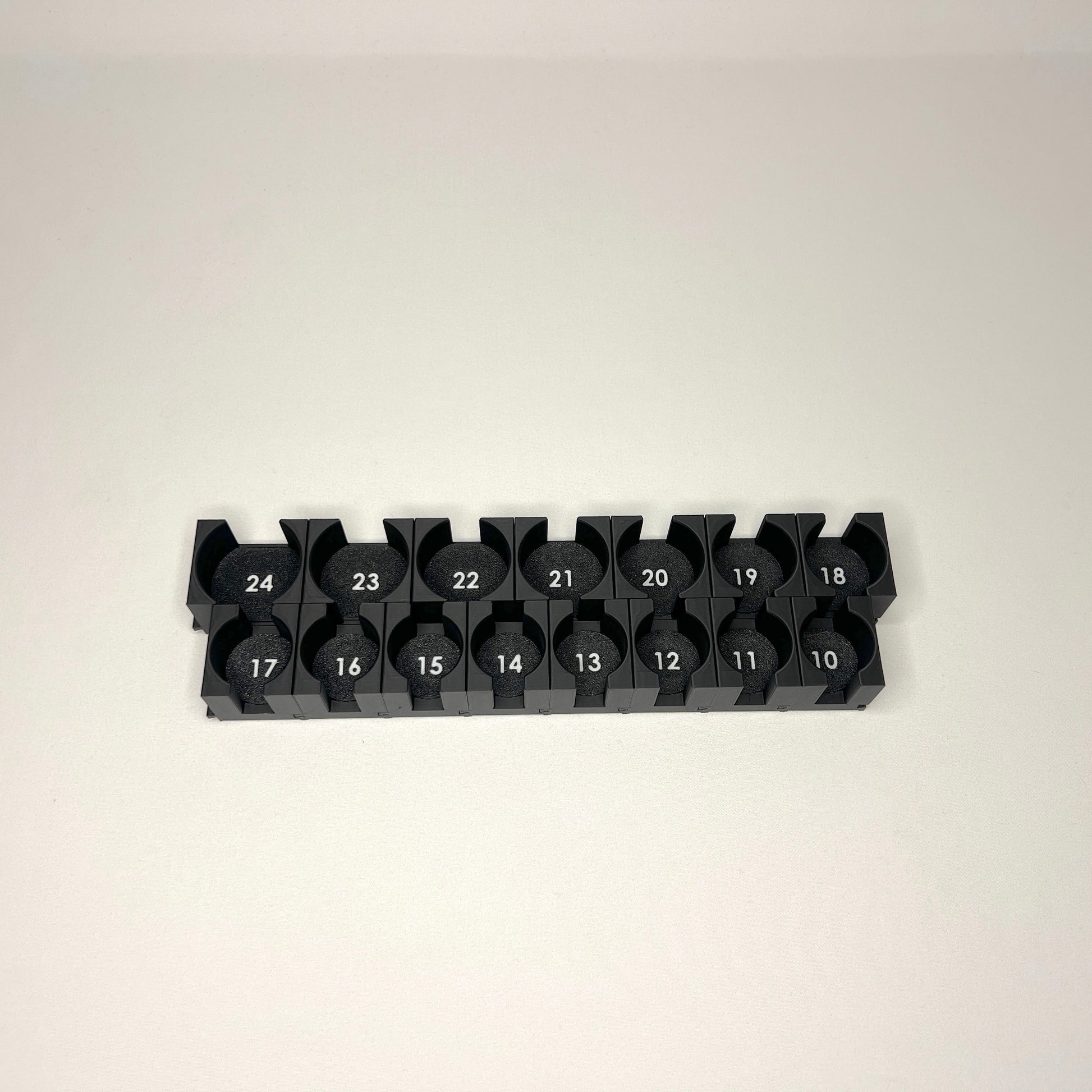 Many socket organizers come in the form of rails or large trays. these organizers work OK, but are prone to wasting space in your toolbox. Rails cannot be adjusted to any specific length to fit your particular socket set. Similarly, one piece trays cannot be enlarged or shrunk to fit your particular socket set. Trays may also include size spaces that you do not use or want wasting space in your toolbox. Our fully modular socket organizers all come with no skip sizing but each size is removable. So, if your socket set skips sizes, you can simply remove that size from the modular organizer to save space in your toolbox.