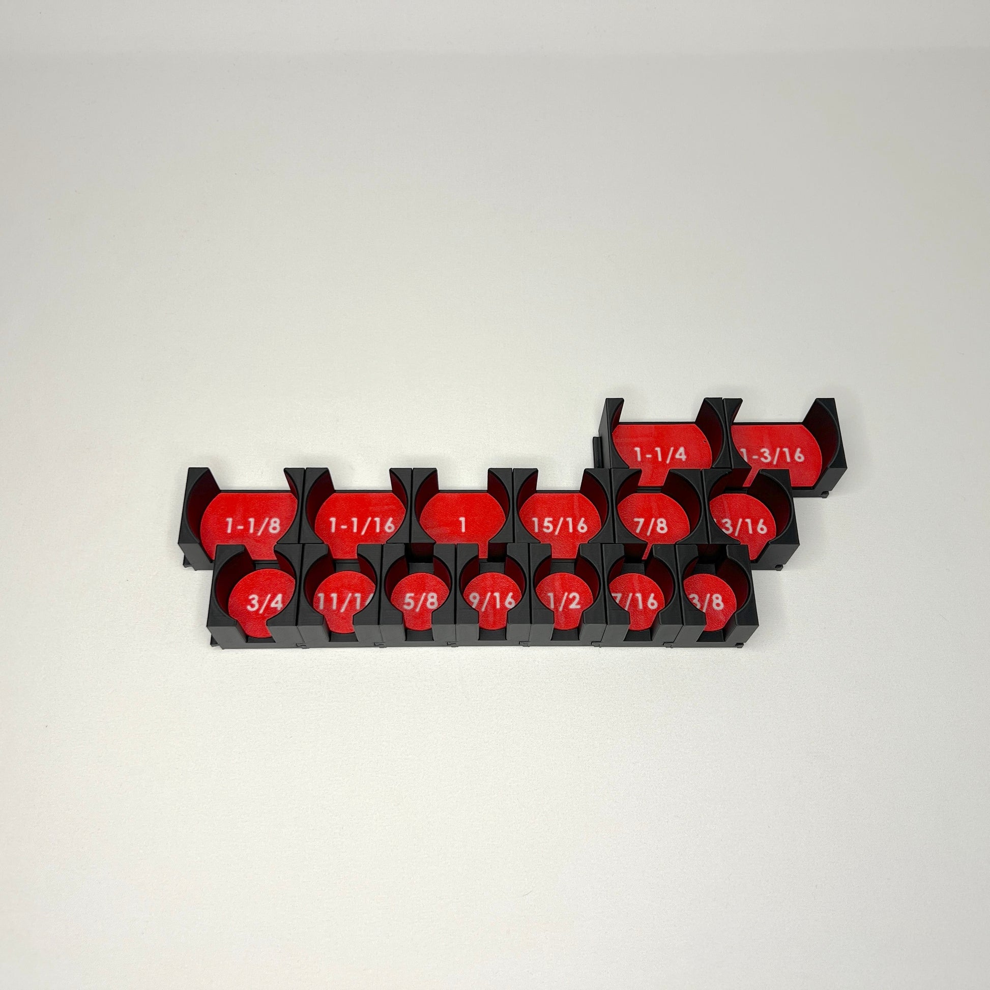 Many socket organizers come in the form of rails or large trays. these organizers work OK, but are prone to wasting space in your toolbox. Rails cannot be adjusted to any specific length to fit your particular socket set. Similarly, one piece trays cannot be enlarged or shrunk to fit your particular socket set. Trays may also include size spaces that you do not use or want wasting space in your toolbox. Our fully modular socket organizers all come with no skip sizing but each size is removable. So, if your socket set skips sizes, you can simply remove that size from the modular organizer to save space in your toolbox.