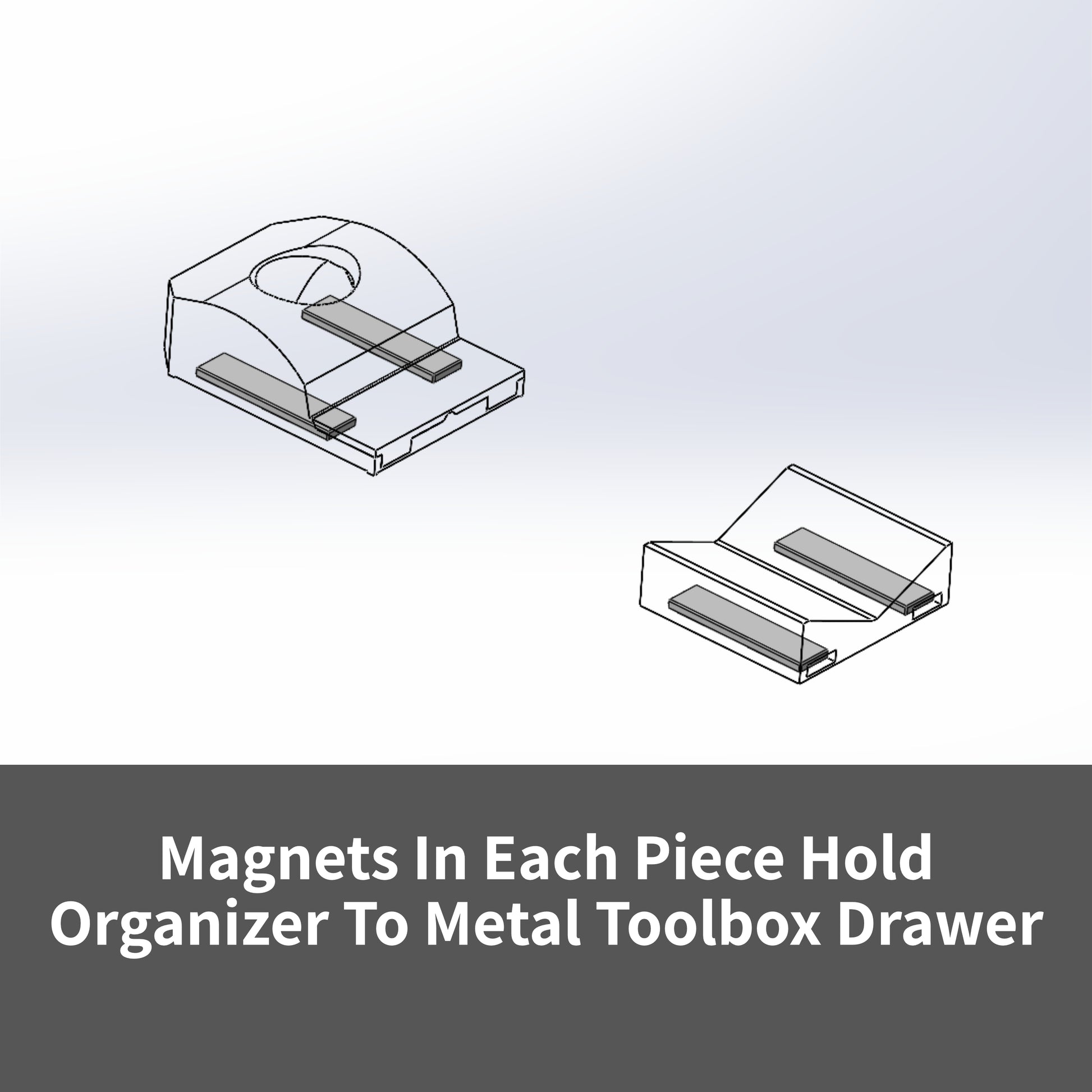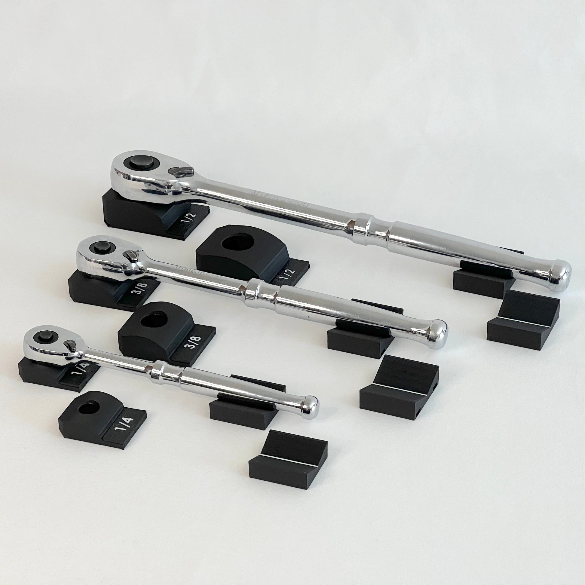 All of our ratchet organizers come with magnets inside that keep the organizer stuck to the bottom of a metal tool drawer. The curved profile at the head end of the organizer ensures that your ratchet will sit firmly in the organizer regardless handle size or length.