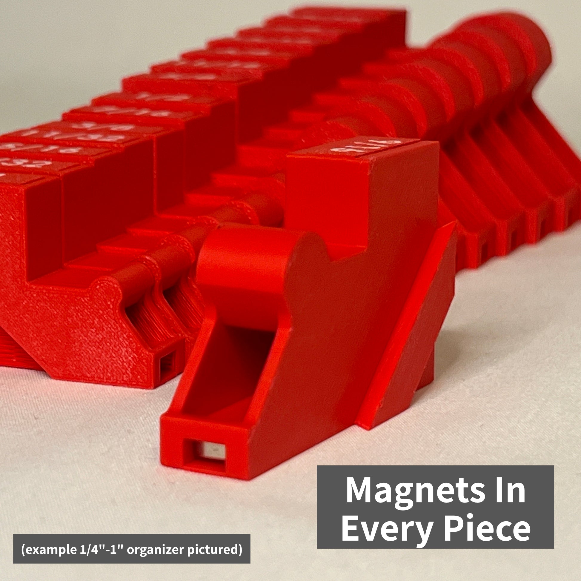 The overall design for these is amazing! The fact that you can mix and match to suit the sizes you have in your wrench set is very smart and not offered or easily recreated with other organizers. The magnets are strong enough to stick them down to my Mac tec series drawer with the OEM drawer liner. They are nice and compact and the prints themselves are beautifully finished. 11/10 highly recommended!