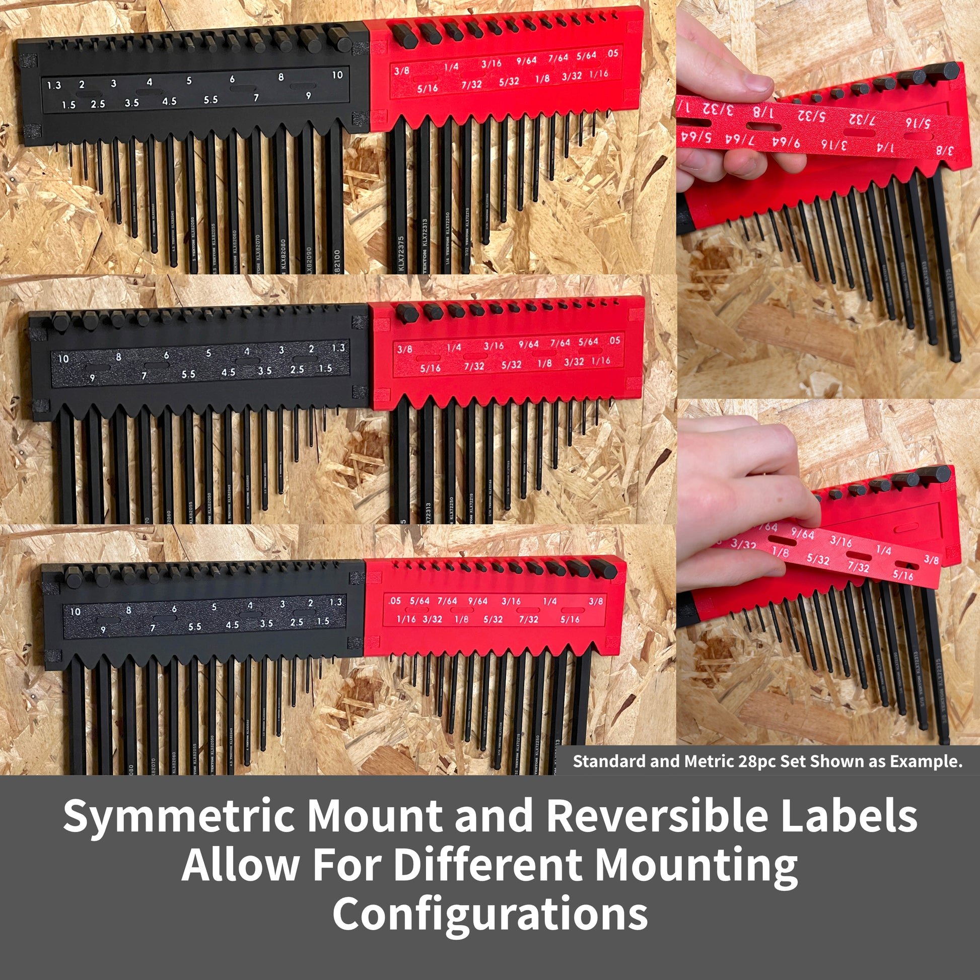 Our unique symmetric design and reversible snap-in labels allow for multiple mounting directions. Any of our allen key organizers can be mounted so that the allen keys are arranged in ascending or descending order.